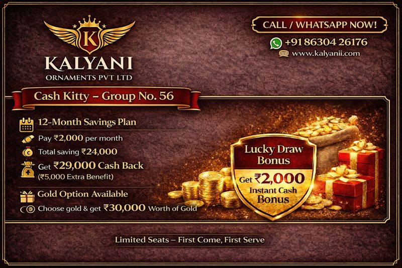 Join the Kalyani Gold KITTY Scheme. Pay just ₹2000/month for 12 months & get ₹29,000 or choose Gold for your favorite jewelry worth 30,000.